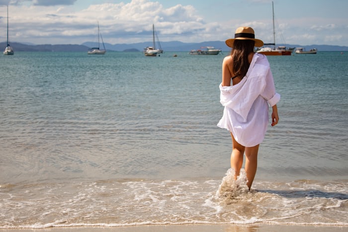 An oversized white linen button-down shirt is a total yay! It gives such a chic look. It’s also light and easy to wear. You can pair it with denim shorts, hat and cute pair of strappy sandals and you’re good to go.